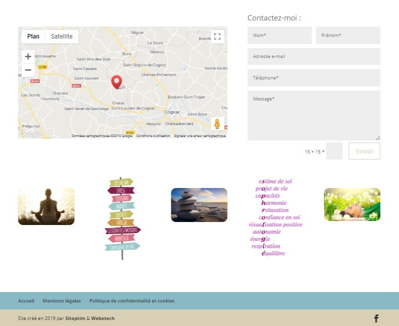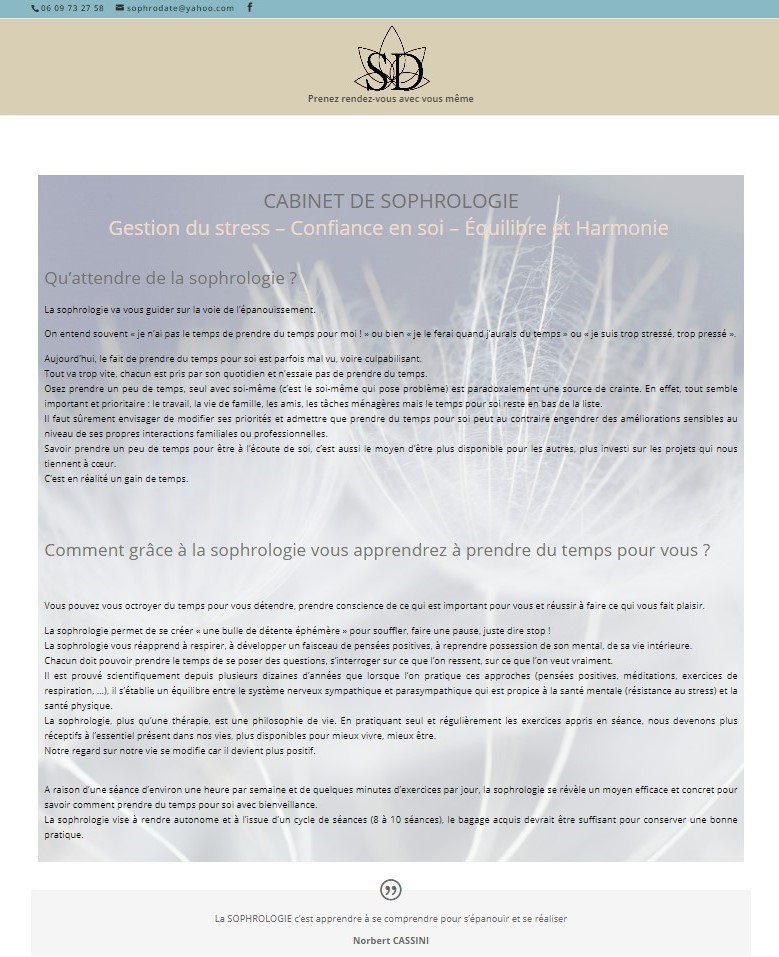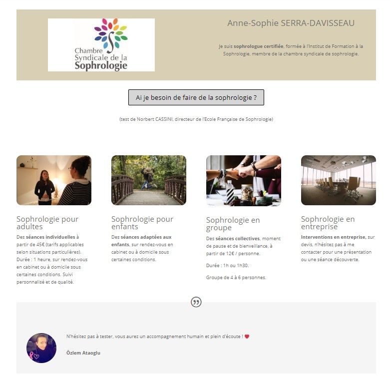 Décembre 2019 : création de site pour Sophrodate (cabinet de sophrologie en Charente-Maritime), mise à jour du logo, page de présentation du cabinet & du concept de sophrologie, test en ligne, différentes prestations proposées, témoignage et formulaire de contact (et aussi : optimisations SEO, mise en place de Google Analytics…).